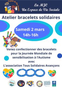 FreeAvec l’association Tous Solidaires Avançons, l’Espace de Vie Sociale de la MJC vous propose de venir réaliser des bracelets pour la journée mondiale de sensibilisation à l’autisme !
