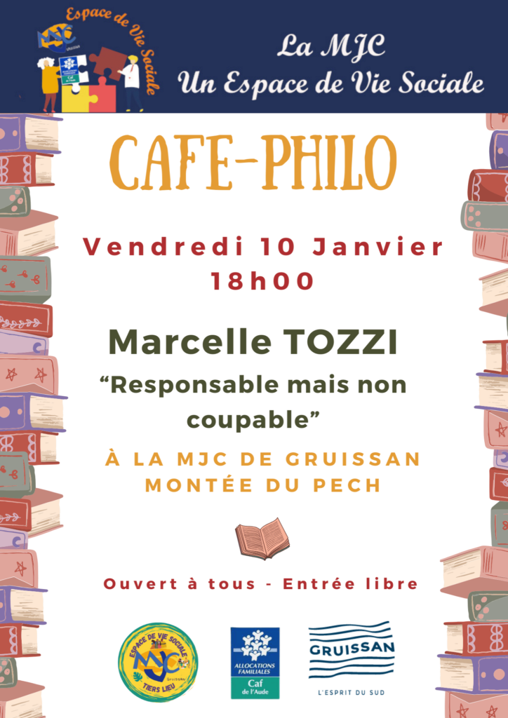 ENTREE LIBREVendredi 10 janvier, à 18h00 à la MJC de Gruissan, Marcelle TOZZI animera votre rendez-vous café-philo !